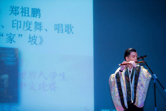 选手登台亮相后,主题演讲、才艺展示和文化知识问答三个环节依次开展。几位选手的演讲或激情澎湃,或娓娓道来,“走进中国”、“我最喜欢的一句话(字)”、“带着梦想前行”等演讲纷纷道明了本届“汉语桥”的“梦想点亮未来”的主题。4号选手郑祖鹏自创新意,以歌曲导入演讲,令在座观众眼前一亮。第二轮的才艺展示环节中,选手们纷纷拿出看家绝活,歌曲演唱、九节鞭、扇子舞、印度舞、水墨画等等,不仅有中国风的表演,亦有东南亚国家的艺术呈现。丰富多样的才艺让人应接不暇,赢得观众们的阵阵掌声与欢呼。