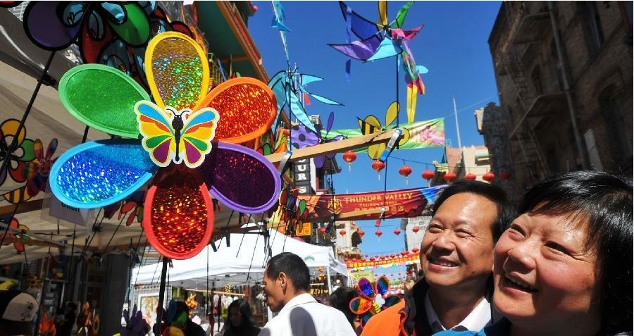 A Chinese couple choose windmill at a street fair for the upcoming Mid-Autumn festival at Chinatown in San Francisco, the United States, Sept. 22, 2012. The 22nd Mid-Autumn Street Fair held by the San Francisco Chinatown Merchant Association kicked off here on Saturday.