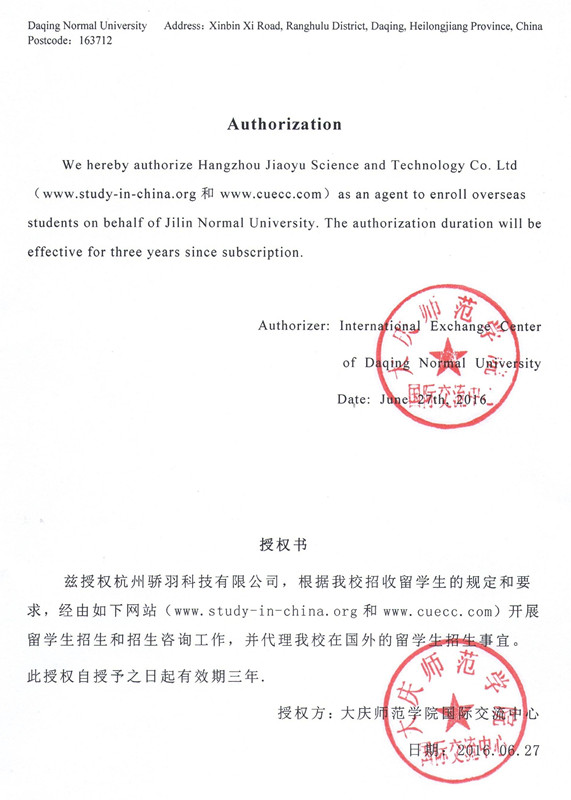 Authorization Letter of Daqing Normal University