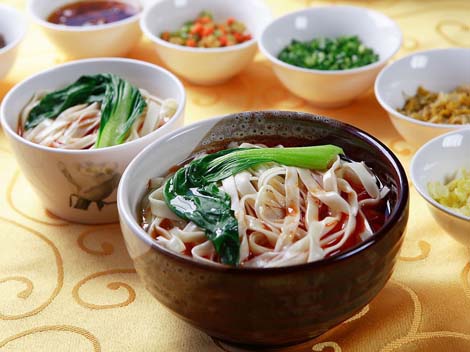 Su's Beef Noodle Restaurant is a chain restaurant with outlets all over China. Beef noodles are delicious and inexpensive. At Su's, one big bowl of noodles will set you back six yuan and a smaller bowl five yuan. The noodles are hand-made from fine flour. The noodles are served with beef, caraway and garlic leaves, which add flavor.