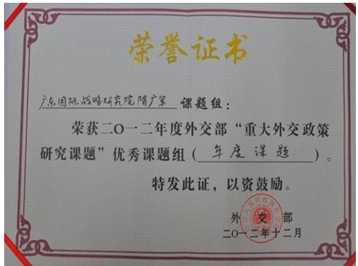 Ministry of Foreign Affairs had launched out over 60 research subjects on major foreign policies in the past three years and it was this year 2012 that the Ministry first appraised and honored those outstanding research teams. The research subject that Guangdong International Institute for Strategic Studies Team worked on, the Opportunities, Challenges of and Proposals for China Globalization Strategy in the international situation was highly praised and adapted by the Ministry, and as well won itself the title 2012 Outstanding Research Subject on Major Foreign Policies.