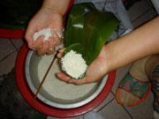 Second, fill in some sticky rice and dates (or pork) into the funnel. The dates can be put in first before being covered with sticky rice, or be put in the middle of the rice.