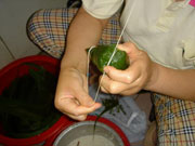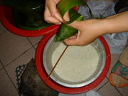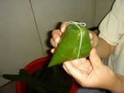 Finally, tie up the zongzi with a thread. It is essential that the zongzi is fast tied, or it will also be dispersed while being boiled.