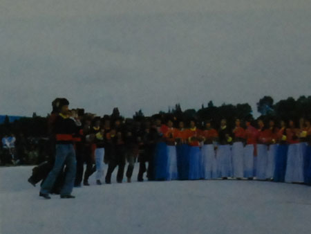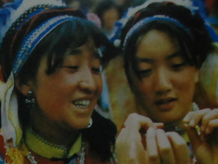 The Primis, with a population of 29.657, mainly live in the Laojun Mountain of Lanping and the foothills of the Maoniu Mountain of Ninglang in the northwest of Yunnan Province. A small number can be found in Lijiang, Yongsheng, Weixi, Zhongdian, and Yanyuan. Mull of Sichuan Province living side by side with other ethnic groups. A Primi old woman is weaving. Though dress of the Pnmis living Iri Laojun Mountains of Lanping rssambtas thai of the neighboring Bais, there is a distinct diversity ol customs between the two. Here a Primi woman is going to show her vocal imitation skills tftth a piece of tender rattan. The Primi people living in Ninglang area celebrate their annual Changxin Festival Coming back from a fair.