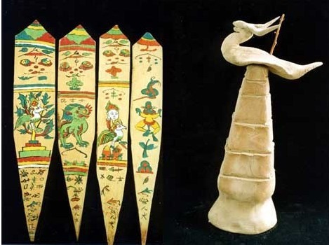 To date, we can still detect the trace of pictograph in Dongba culture. Compared with other ancient characters in the world, Dongba pictograph can still be recognized, interpreted and adopted by the living Dongba, as a result, it is called "living pictograph". A lot of puppets, dough idols, clay sculptures and various bamboo and wood plaited articles made for religious and sacrifice ceremonies. These things are characterized by unique molding and vividness; thus, they reflect the artistic essence of Dongba Art. They are the genius works of arts of China's ethnic minorities.