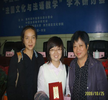 Qin Xiao with her teachers--Yang Xiaomin (left), Chen Huixiang (right) |