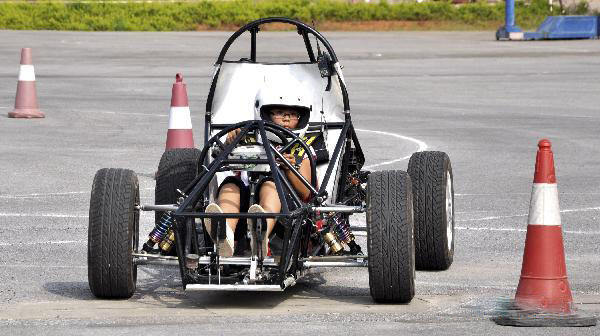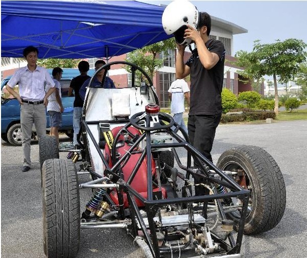 A student tests a race car, built by students of LS Racing team from Guangxi Engineering College, in Liuzhou, southwest China's Guangxi Zhuang Autonomous Region, Sept. 8, 2010.