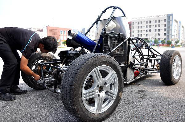 A student checks a race car, built by students of LS Racing team from Guangxi Engineering College, in Liuzhou, southwest China's Guangxi Zhuang Autonomous Region, Sept. 8, 2010.