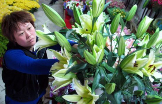 A florist arranges a bunch of lilies at a flower market in Ji'nan City, capital of east China's Shandong Province, March 28, 2011. As the traditional Qingming Festival approaches, the price of the flowers as tribute to the dead has been on a rise with that of chrysanthemum and lily both refreshing a new high. Qingming Festival, or Tomb Sweeping Day, is a traditional Chinese festival for honoring ancestors and the deceased.