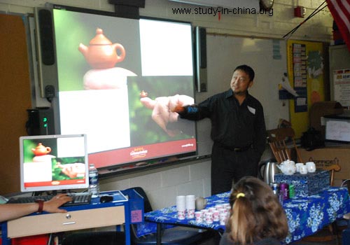The lecture was comprised of two parts which included an introduction as well as a demonstration of Chinese tea and proper tea drinking etiquette. At the beginning of the lecture, Prof. Yan introduced Chinese tea culture and teapot art to the students. The teapot is the one of the essential tools for tea drinking and is also a highly accessible form of visual art for American adults and children. Prof. So Weihong Yan started with the visual materials, such as pictures and videos, in which elementary students are very interested. He also chose the image of Kungfu Panda loved by all the American children to lead the questions in his slide show. Kung fu Panda asked the students several questions about tea culture, such as “What is Chinese tea culture? What does Chinese tea benefit people? When Did Chinese start to Drink Tea? Where do Chinese people drink tea? What is Chinese famous Tea? What is the most famous teapot in China and where?” These questions helped students to understand Chinese tea culture step by step.