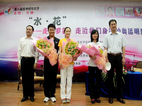 Oct. 17th—The 2nd Annual Library Culture Festival of GDUFS was held on October 14th. A meeting entitled, "Get Close to Qian Luo and the Olympic Stars Around Us" was held successfully in the basement of the north campus library. Qian Luo, who won a silver medal in the team competition of synchronised swimming at the 2012 London Olympics, was there. Two gold medalists from the 2004 Olymics held in Athens were also there, namely, Jia Hu, winner of the men’s Guangjun Sui gave a speech at the opening ceremony. He emphasized that libraries play a great role in modern society. They are not only the heart of a unversity, but also the base of the success. He expressed that the Library Culture Festival was a symbol of the development and maturity of GDUFS?libraries. He also said that the theme of this year's festival,“Blend? had a realistic significance. With the aim to develop a high-level university with international distinctive features before 2025, GDUFS needs to face different challenges and interactions to create a "blend" of ideas from different cultures. Conversing with the olympic stars, realizing their inspirational stories and cultivating their determined spirits was a perfect reflection of the theme. Youqi Shi introduced the theme of this Library Culture Festival and he shared his hopes that participants would develop a deeper understanding about the meaning of ?Blend?through a series of themed activities. Apart from the Living Library, the main activities of this festival also included the micro film competitions, academic forums, and more! The Chief Librarian, Fangfei Wu, made some illustrations about the Culture Festival. He said nowadays books are challenged by networks and digitization. That is why GDUFS held the festival, to improve the library's networks, strengthen the culture construction and promote humanistic values. Later, Guangjun Sui presented the olympic stars with souvenirs and posed for group photos. Guangjun Sui, Youqi Shi taking group photos with the Olympic athletes. The meeting was divided into three parts: 1)Getting close to Qian Luo, 2) getting to know Jia Hu and Lishi Lao, and 3) having a time for questions and answers. Throughout the event, the library played a video of Qian Luo’s competition in London and an interview from her teammate XiaoJun Chen. Audiences also reviewed her photos at various periods. About how to balance training and study, Qian Luo expressed that though tired, she found a good balance beween these two necessities. Her teammate mentioned in the video that Qian Luo had never asked for leave because of illness or injury. Lishi Lao also said that because of sports, she became strong minded and learned how to deal with things in a better way. Laslty, Jia Hu said he believed that success was not far away, which helped him to persevere through his hardships. Jia Hu answering the questions. The audiences took an active part in the question-and-answer portion and the three Olympic champions replied to the audience's various questions. Before the opening ceremony, Party Secrety Guangjun Sui met the three Olympic stars in the Yunshan Station and he shared his hope that all of them would enjoy the university life and be able to share their experience with GDUFS students after graduation. Guangjun Sui and Youqi Shi giving a tea reception to the three Olympic athletes.