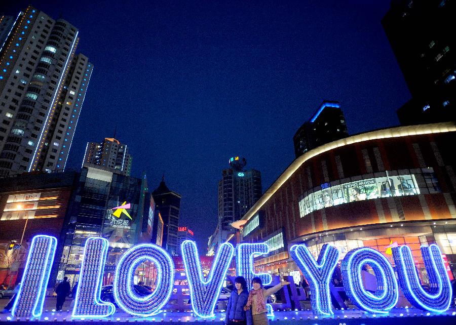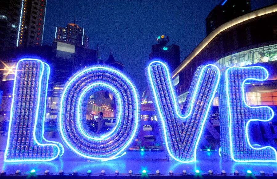 People walk past the Valentine's Day decorations made of pop cans in Shenyang, capital of northeast China's Liaoning Province, Feb. 12, 2012.