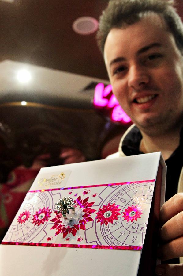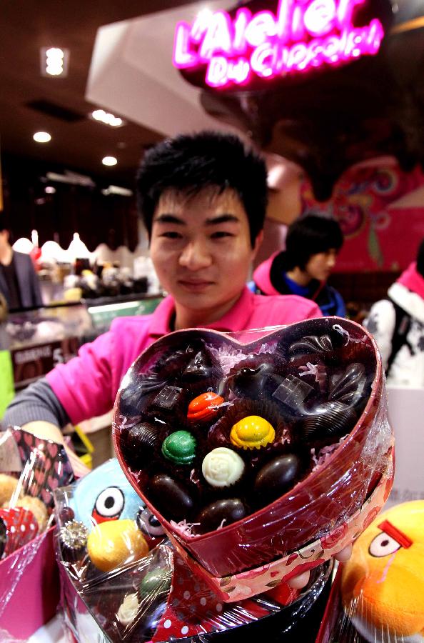 A staff of a chocolate shop displays a special box of chocolate for the Valentine's Day in Shanghai, east China, Feb. 13, 2012. For the approaching Valentine's Day, many shops made special festival presents for lovers.