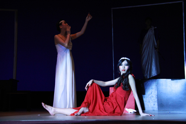 After an intermezzo of singing and Latin dancing, the third play was on, "Phaedra", a dramatic tragedy based on Greek mythology. In the absence of her royal husband Thésée, Phaedra ends by declaring her love to Hippolyte, Thésée's son from a previous marriage. This play features the inner struggle of Phaedra who is presented to us using two actresses: one in white, representing Phaedra as the queen and the other one in red, living out the desire and self of Phaedra. They effectively used different colors for symbolism. Their play was elegant and they successfully kept the original poetic quality of the play after adaptation, giving the audience a glimpse into the far-back and mysterious life and love of ancient Greece.