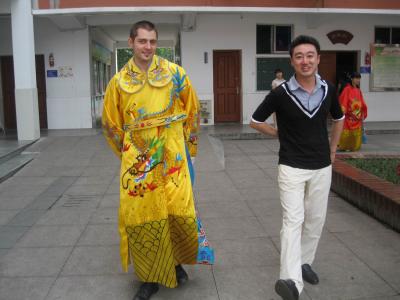 In addition we were also given the opportunity to try out to wear some of highly traditional costumes. What a picture that made seeing myself in an emperors garment! As I was the only male student among the four foreigners I, of course, was the emperor and the girls were my wife & concubines. My only problem, however, was that I could never decide who of them was to be my wife and who my concubines.. Yet, in any case, my female colleagues all seemed to not be too happy about the question I faced anyway. Several photos were taken of ourselves and many more together with the children outside. Furthermore, we were also taught some traditional dances by some teacher which we tried to imitate, yet, in my opinion, only with very limited success. But I think we and the children all enjoyed it a lot.