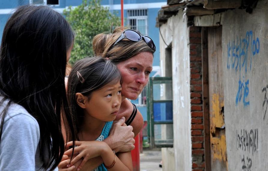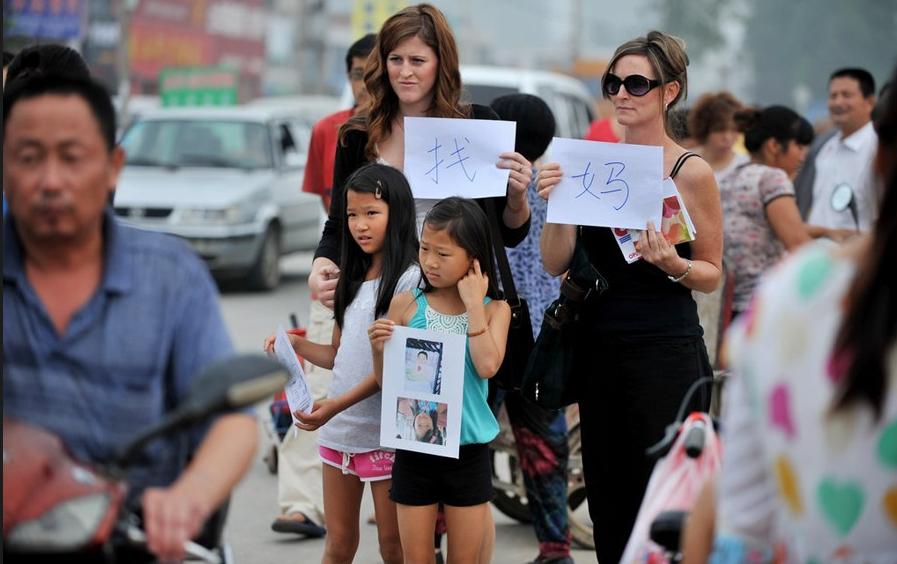 On July 15, a 9-year-old abandoned girl was seaching her maternal mom in Huainan Anhui province with her sisters and her American Mom Maria who adopted her in 2005, beholding pictures of her in age 2.