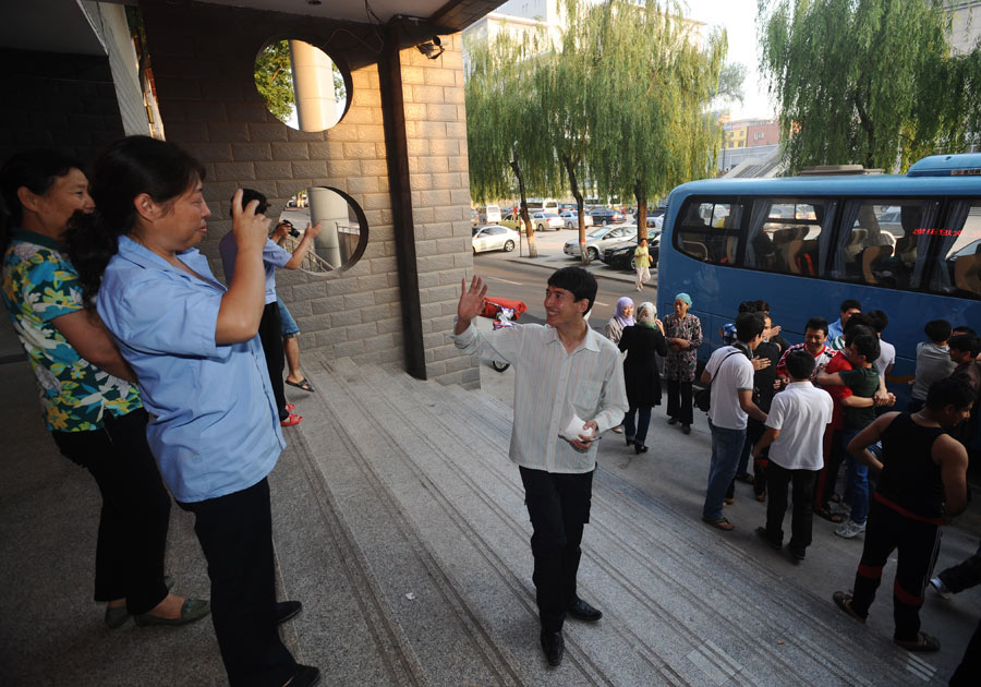 Salman Raha (C) bids farewell to a dormitory administrator at Taiyuan University of Technology in Taiyuan, capital of north China's Shanxi Province, July 11, 2012.