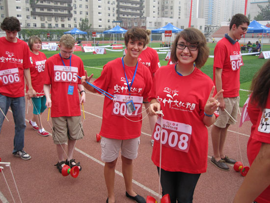 For better understanding of China, the summercamp also arranged visitsto the Chinese culture exploratorium at the Hanban/Confucius institute Headquarters, the Forbidden City, Great Wall, Tai mountain, Confucius' hometown in Qufu, and other attractions. The organizers also helped the campers to find language partners. In addition to language tutoring, the campers practiced the language throughshopping, eating hot pot, playing table tennis, and watching Chinese movies with their language partners, to experiencethe real Beijing people's life. What deserves to be mentioned the most is that the campers on behalf of the American high school students participated in the National DiaboloCompetition. The campers who had never seen diabolo before called it "Chinese yo-yo". They were trained by some professionaldiabolo game player and performed very well in the contest.
