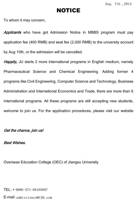 Notice for All the Foreign Students Apply to Jiangsu University September Intake 2012