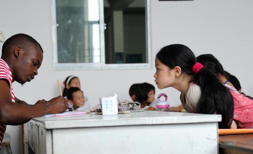 A schoolgirl looks at her foreign teacher Musasizi Isaac curiously during a class in Limin school, a school for children of migrant workers, in Jiaojiang District, Taizhou City, east China's Zhejiang Province, Sept. 13, 2012. Isaac arrived in China four months ago, and he now teaches English to two classes in this school