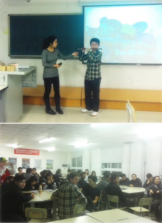 Chinese volunteers joined in the activity and showed their music talents by playing flute and erhu, the traditional Chinese musical instruments. This fantastic show aroused the interests and curiosity of international students who itched to have a try.