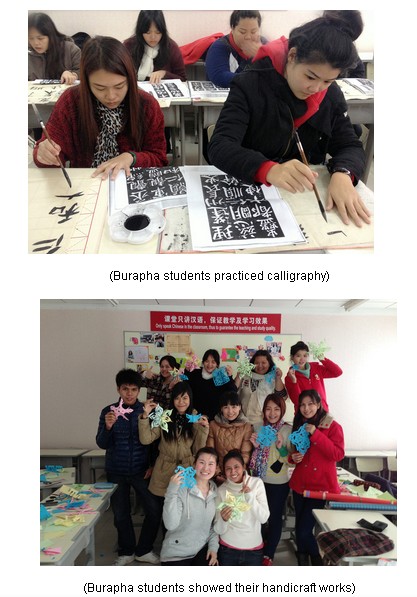 During two-week study, all the students from Burapha enjoyed learning Chinese language and culture. Furthermore, they learned to make traditional Chinese handicrafts such as paper-cutting. Professor He from College of Fine Arts Design was also invited to teach Chinese calligraphy to all the Burapha students.