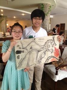 First, we taught Babur from Uzbekistan and Sonal from Fiji to play Wuzi chess, a traditional chess that they had never known before. Then here came two boys from Thailand, one of them with nickname “Good”. Via talking, we knew that his grandfather was Chinese and he also had a Chinese name—Yang Laihao, which meant “blessed with good”. They both loved painting, so we instructed them how to hold Chinese painting brush and then how to paint. They mastered some basic skills to paint with our effort and corporation, they finished a painting of a fierce dragon, and we exchanged what we drew as present to each other.