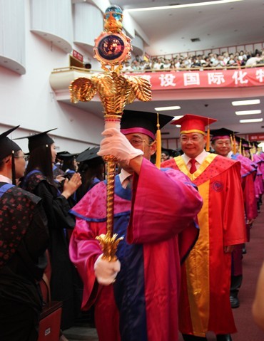 The commencement ceremony of GDUFS' class of 2013 which was chaired by Liu Jianda was held in Yunshan Hall on the north campus of GDUFS on the afternoon of June. 24th. President Zhong Weihe, Vice-CPC Secretary Chen Jianping, vice-president Gu Yeli and deans of different faculties had attended the ceremony. The national anthem served as the prelude of the commencement ceremony after the leaders' entering with a scepter.
