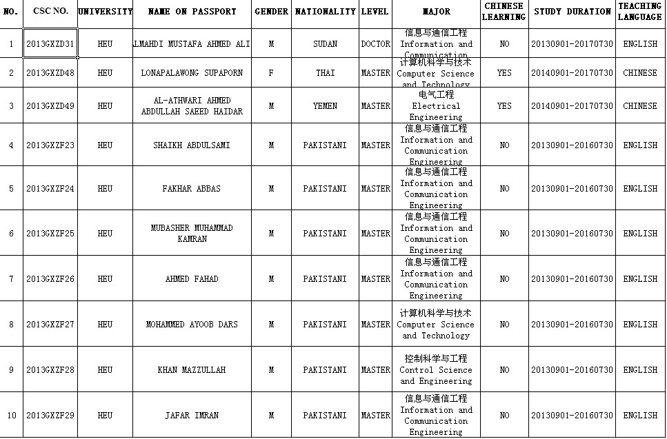 2013 CSC UNIVERSITY SCHOLARSHIP AWARDING LIST of Harbin Engineering University