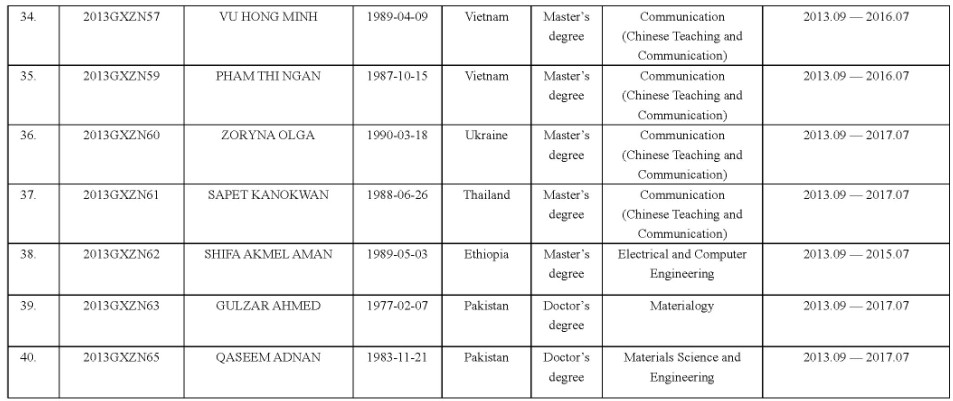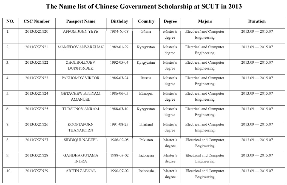 The Name list of Chinese Government Scholarship at SCUT in 2013