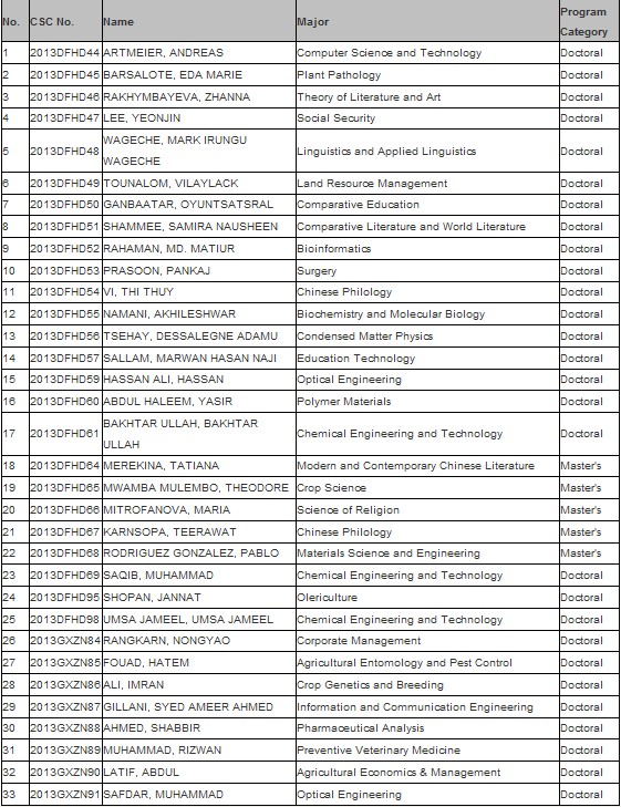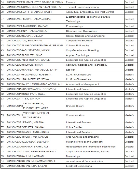 Announcement of Awardees List of Chinese Government Scholarship 2013/2014, Zhejiang University