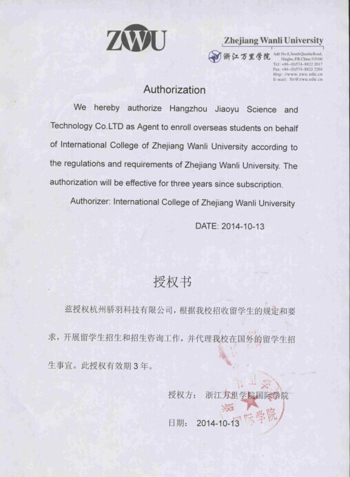 Letter of authorization from Zhejiang Wanli University