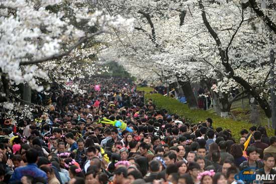Japanese Cherry Blossom trees line the 300 meter boulevard, with snow white blossoms in full bloom. The university says it has tried to control visitor numbers to limit disruption to campus life, but despite that, 100,000 people have flocked there to enjoy the floral delight.