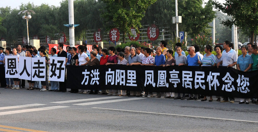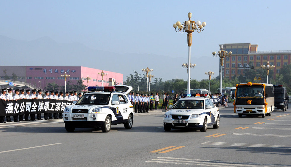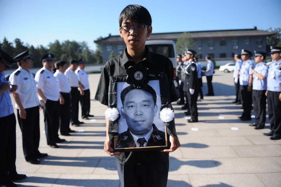 On July 29, in the Beijing district of Fangshan, escorted by police cars, accompanied by his family, Li Fanghong's hearse slowly pulled out of Yanhua hospital gate. Tens of thousands of local residents stood on both sides of the road, holding chrysanthemums, putting up banners, and waiting in a line which stretches for 56 kilometers to see him off. Li is a police inspector who lost his life while trying to rescue villagers trapped by floodwaters, at the Babaoshan Revolutionary Cemetery in Beijing, capital of China, July 29, 2012. Li, 45, was electrocuted by a live wire that had fallen into the water after rescuing 63 people in the village of Fenghuangting in the suburban Fangshan District on July 21, when the heaviest rain in six decades battered the capital city.