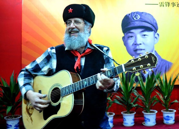 He has taken his guitar to ceremonies honoring Lei Feng - a selfless PLA hero that the country has honored during the 1960s and every March 5 nowadays. He has played at one rally of 50,000 people - "that's more people than saw the Beatles at Shea Stadium!" - and many social and education events. Levine has performed in bars and clubs, and also on TV shows and during festivals. Red songs he has learned include Without the Party There is No New China, The East Is Red, Why Are the Flowers So Red and Liuyang River.