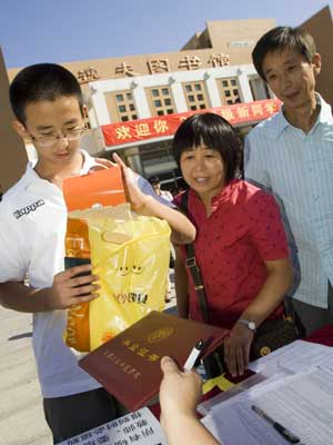 Zhang Xinyang (L), 13, registers at Beijing University of Technology with the accompany of his parents in Beijing, Sept. 2, 2008.