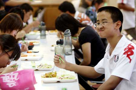Zhang Xinyang (front R) has dinner at a canteen of Beijing University of Technology in Beijing, Sept. 2, 2008.