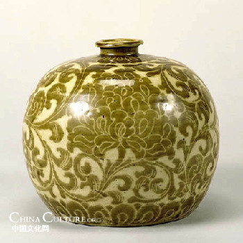 Among the ceramic wares of the Northern Song Dynasty at its zenith, one finds Yaozhou ware. The kiln site for this ware has been discovered in Tongchuan, Shaanxi Province, north of Xi’an. The celadon glaze is often seen in an olive green color that is the result of oxidization during the firing process. It is also common to find a boldly-carved design covering most of the surface. The shape falls into the category of the tuluping, and at present it is the only one of its kind among Yaozhou celadon ware. The carving technique, called katakiribori in Japanese, leaves one side of the cut perpendicular to the surface and the other side with a slant. Here the celadon glaze fills the carved areas to create a beautiful feeling of depth befitting the worldwide fame of this piece.