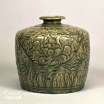 BOTTLE: Celadon with Carved Peony Scrolls Design