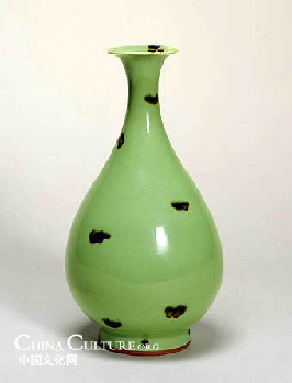 This bottle was decorated with iron spots and covered with a celadon glaze, a decorative method which was employed widely at the Longquan kilns in the Yuan Dynasty. This vase is particularly outstanding, both for the color of the glaze and the appearance of the iron spots. This type of form is popularly known as yuhuchun, pear-shaped bottle. The slender neck and full belly present a pleasing contrast, achieving a beautiful balance. The glaze has been scraped away from about five millimeters of the foot rim, revealing the clay body which has turned red in the fire.
