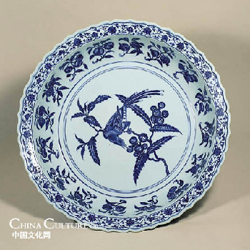 This large dish, with a diameter exceeding 50 centimeters, was made using a mold and then fired skillfully to obtain a non- warped form. A delicate floral scroll graces the foliated rim. The sides of the dish are divided into 16 sections containing pomegranate, peach and other auspicious fruits. In the center, a magpie eats berries on a branch. The composition is spacious, and the brush work is both decorous and elegant, making this a typical example of early Ming Dynasty pictorial design. Several other similar pieces are known to exist.