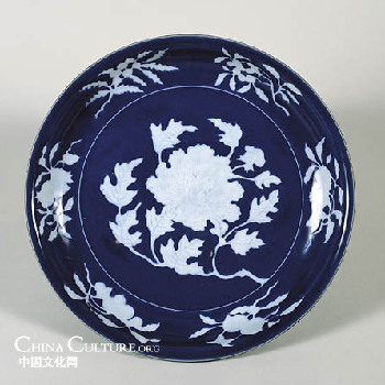 DISH: Porcelain with Reversed Peony Decoration against Cobalt-Blue Glaze