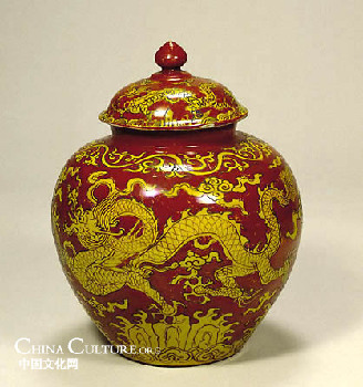 COVERED JAR: Porcelain with Overglaze Yellow and Red Enamels; Dragon Design