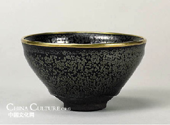 The Chinese describe this vessel type as dizhu, meaning beautiful drops, for the exquisite beauty created by myriads of iridescent “oil spots.?Jian tenmoku tea bowls were shipped in quantity to Japan during the Yuan Dynasty and the early Ming Dynasty. Among these wares, Tenmoku Glaze with Silvery Spots was prized the most. This tea bowl has long been considered an unrivaled piece of “oil spot?tenmoku.