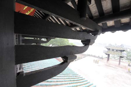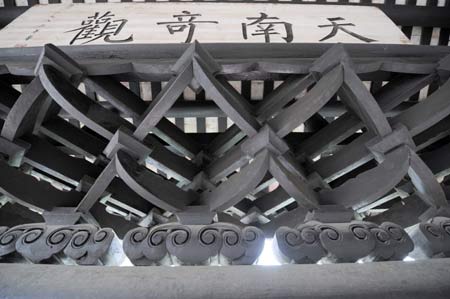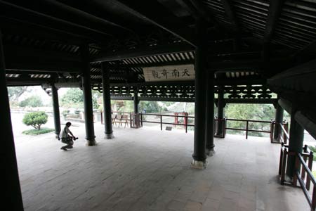 Photo taken on Nov. 5, 2008 shows the Zhenwu Pavilion in Rongxian County, Yulin, southwest China's Guangxi (school in Guangxi, study in Guangxi)Zhuang Autonomous Region. Located on the northern side of Xiujiang River, Zhenwu Pavilion was originally built in 1573 and has a history of more than 430 years. In virtue of the ingenious structure, the three-storeyed wooden building constructed in Ming Dynasty (1368-1644), was listed among the four famous towers in ancient South China. The pavilion comprises a structure of some 3,000 pieces of timber, perfectly assembled according to the lever principle. The four hypostyle columns on the second floor that are suspended from the ceiling and support it, the roof girders, tiles, and roof-ridge ornaments, are its most impressive feature. The Zhenwu Pavilion is well preserved, despite no rebuilding of any kind over the past 400 years or more. Althougt attacked in the past 400 years by earthquakes and typhoons, Zhenwu Pavilion, still rests in a whole skin and becomes the only ancient building in China in good repair without the aid of reconstruction.
